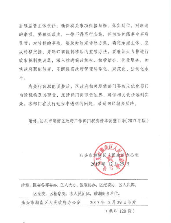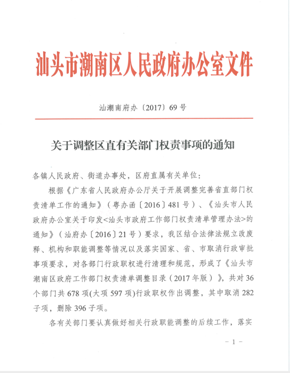 汕头市潮南区政府工作部门权责清单调整目录(2017年版)